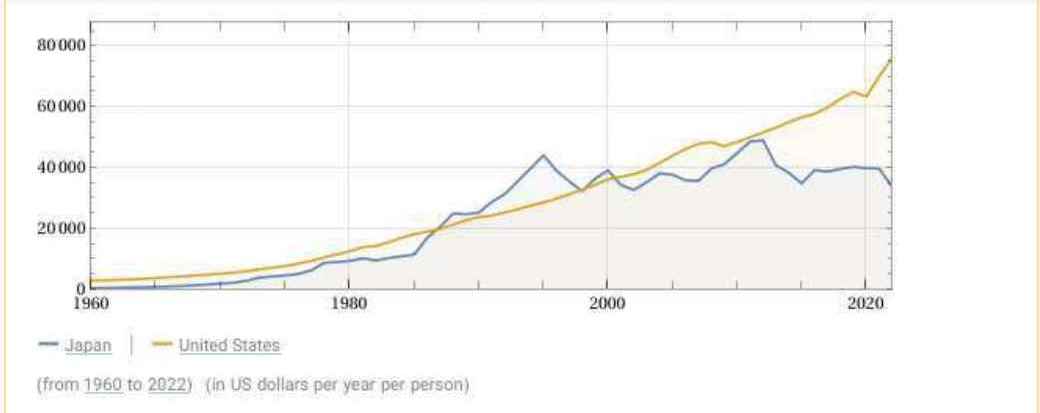 隨著經濟起飛,人均收入也增加了。從 1983年開始,日本的人均收入超越美國,一直到 2001年才再被美國追上。