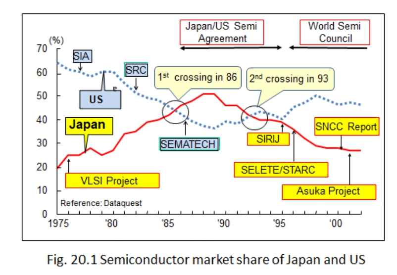 從 1976年開始、日本六大電子公司 (日立、日本電氣、三菱電機、日本電信電話、東芝、富士通) 成立了 Super LSI Technology Research Association,開發關於積體電路(IC)、微處理器和微控制器的製造和應用。在 1986年,日本成為全世界最大的記憶體晶片製造國、成功令美國的半導體公司退出記憶體晶片市場,從而使日本取代了美國成為世界最大半導體生產國。到了 1988年,世界一半的半導體在日本生產。